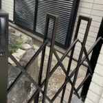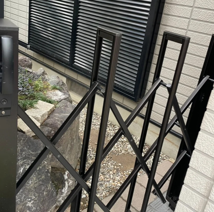 今回は、壊れて開閉できなくなっていたガレージ側の伸縮門扉を新しく入れ替えさせていただきました。 あわせて、玄関横の門扉も同じ仕様で取替を行い、統一感のある仕上がりになっています。