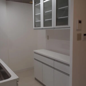 キッチンスペースに収納力の高いカップボードを新設しました。 上部にはガラス扉の吊戸棚を配置し、食器を見やすく取り出しやすいレイアウトに。 下台との組み合わせで、家事動線がよりスムーズになる使い勝手のよい空間へと仕上がりました。