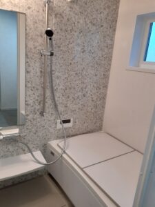浴室は落ち着いたグレーで統一され、清潔感と上質感を演出しています。