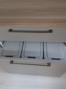 また、使い勝手に配慮したゴミ箱スペースをキッチン内に設け、生活感を抑えつつすっきりとした印象を実現しました。