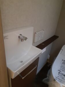 手洗い付きのタンクレストイレを採用することで、空間全体をすっきりと整えています。