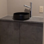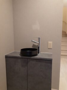 落ち着いた色合いのカウンターと洗練されたデザインの手洗い器が、空間に上質感を与え、